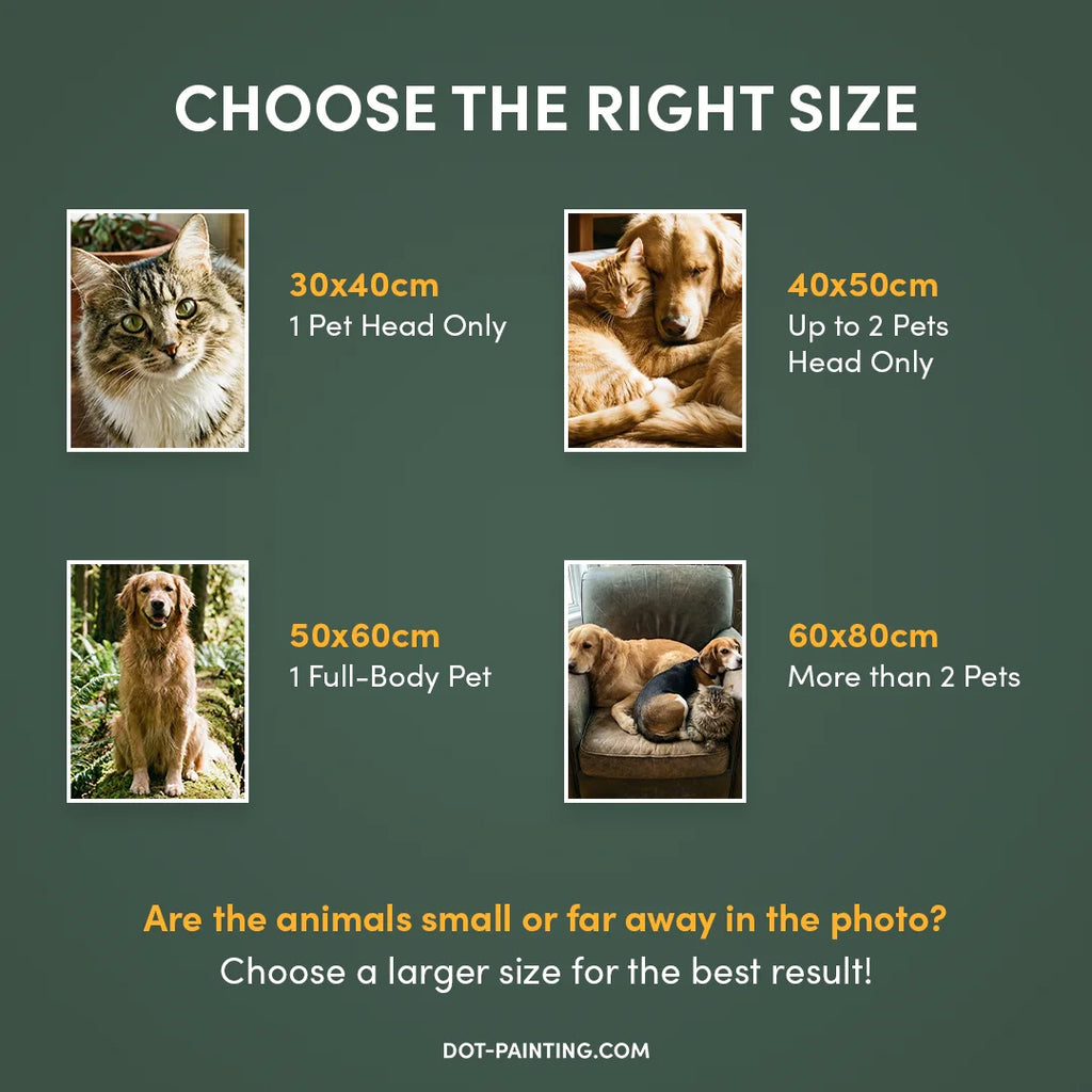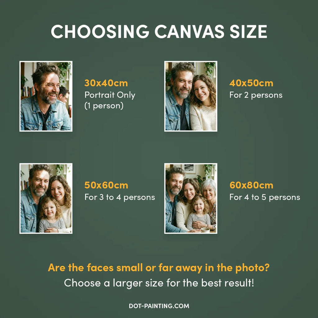 Storleken spelar roll Även om den mindre storleken 8x12" är söt för enkla bilder, rekommenderar vi starkt att du väljer en storlek på minst 12x16" eller 16x20" för bästa resultat. Tumregeln för prickmålning är enkel: ju större duk, desto fler detaljer kan vi fånga, och desto mer fantastiskt blir ditt slutliga mästerverk.