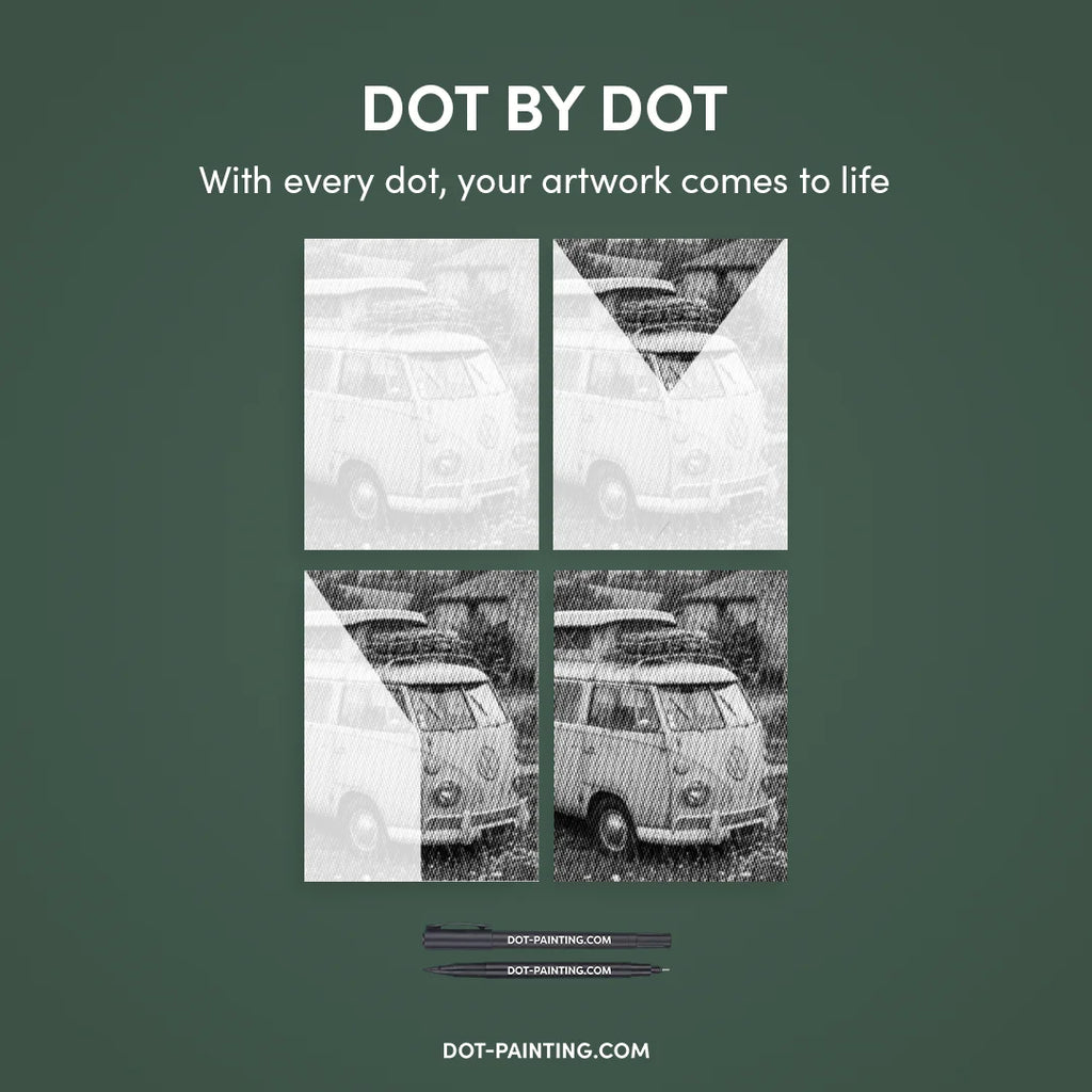 Med prickmålning använder du högkvalitativa markörer för att väcka Oude VW-bus prickmålning-kit till liv, en prick i taget. Det är renare, enklare och otroligt tillfredsställande.