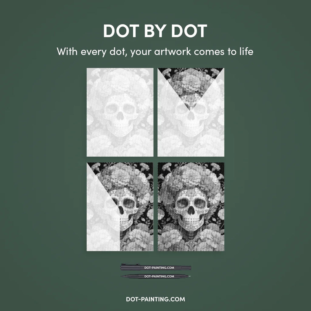 Med prickmålning använder du högkvalitativa pennor för att väcka Sugar Skull prickmålning-kitet till liv, en prick i taget. Det är renare, enklare och otroligt tillfredsställande.