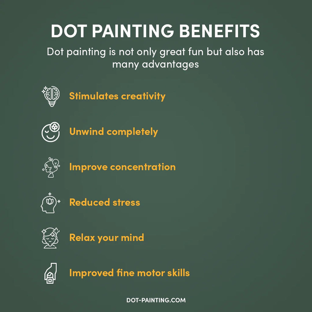 - Set med dubbelspetsade pennor: Specialpennor för prickmålning med två sidor: 1,0 mm spets för att fylla större prickar snabbt. 0,5 mm spets för precision och små detaljer.
