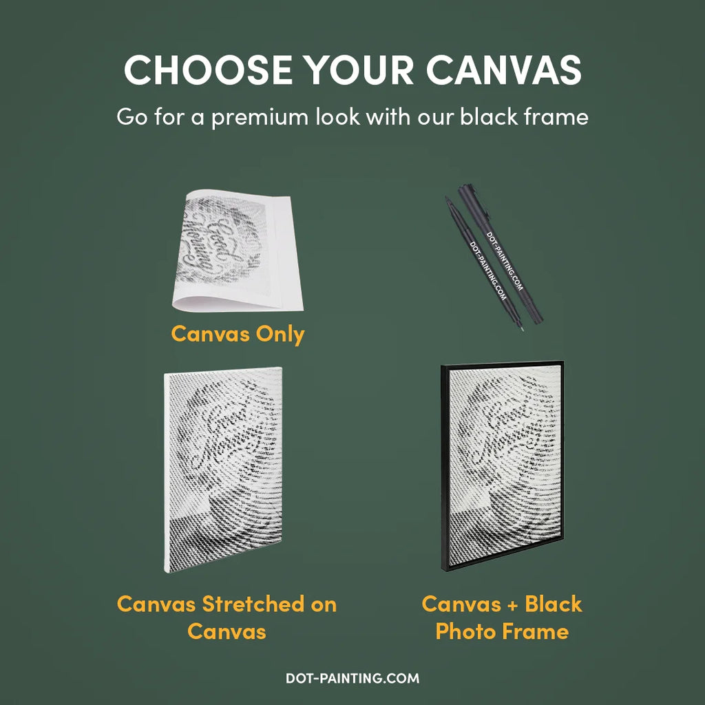 • 1x Premiumduk (rullad): Högkvalitativ duk med ditt valda motiv. Vi skickar den rullad i ett hårt rör, aldrig vikt, så att du börjar med en slät, veckfri yta.